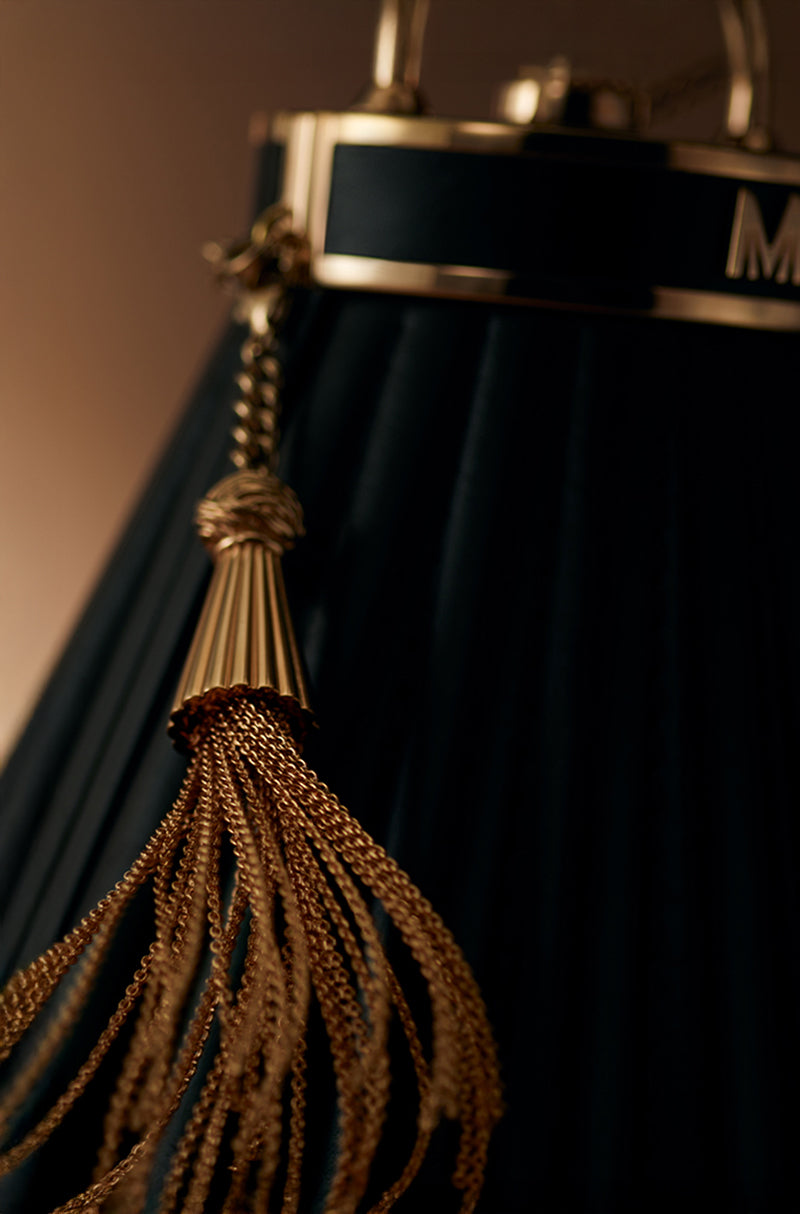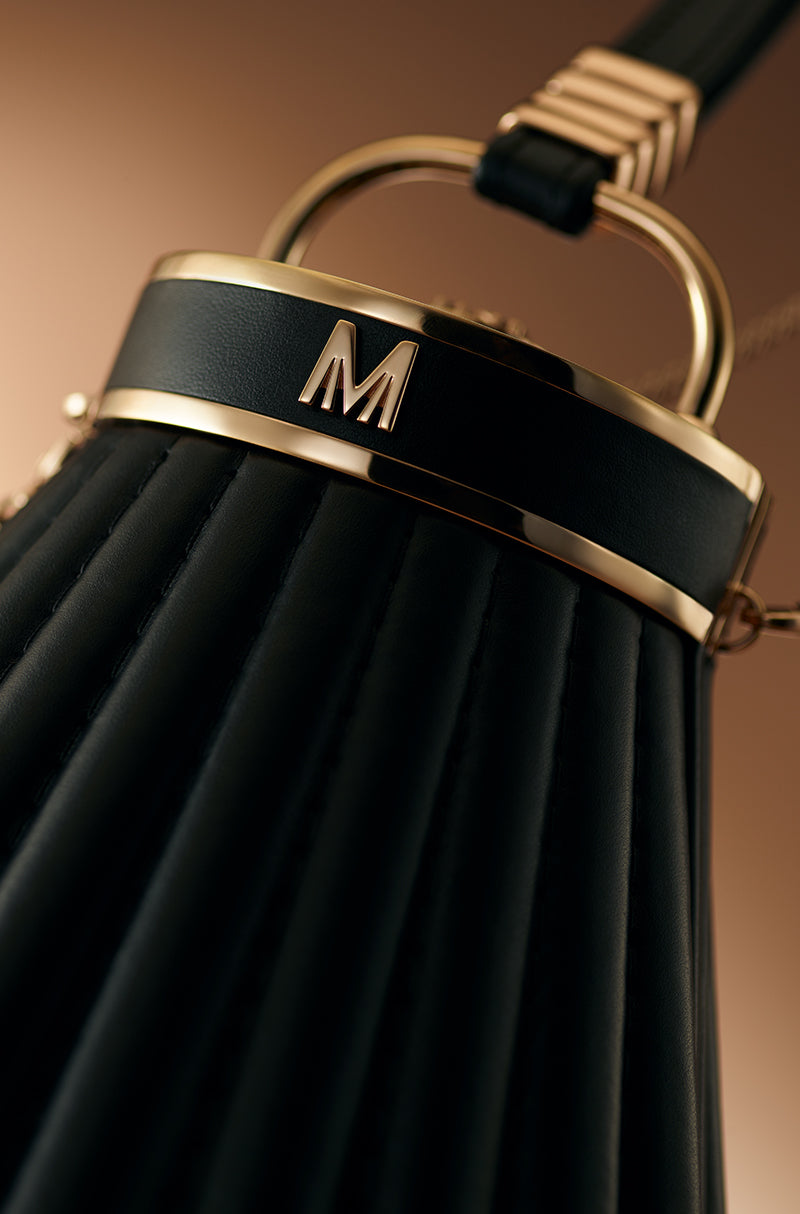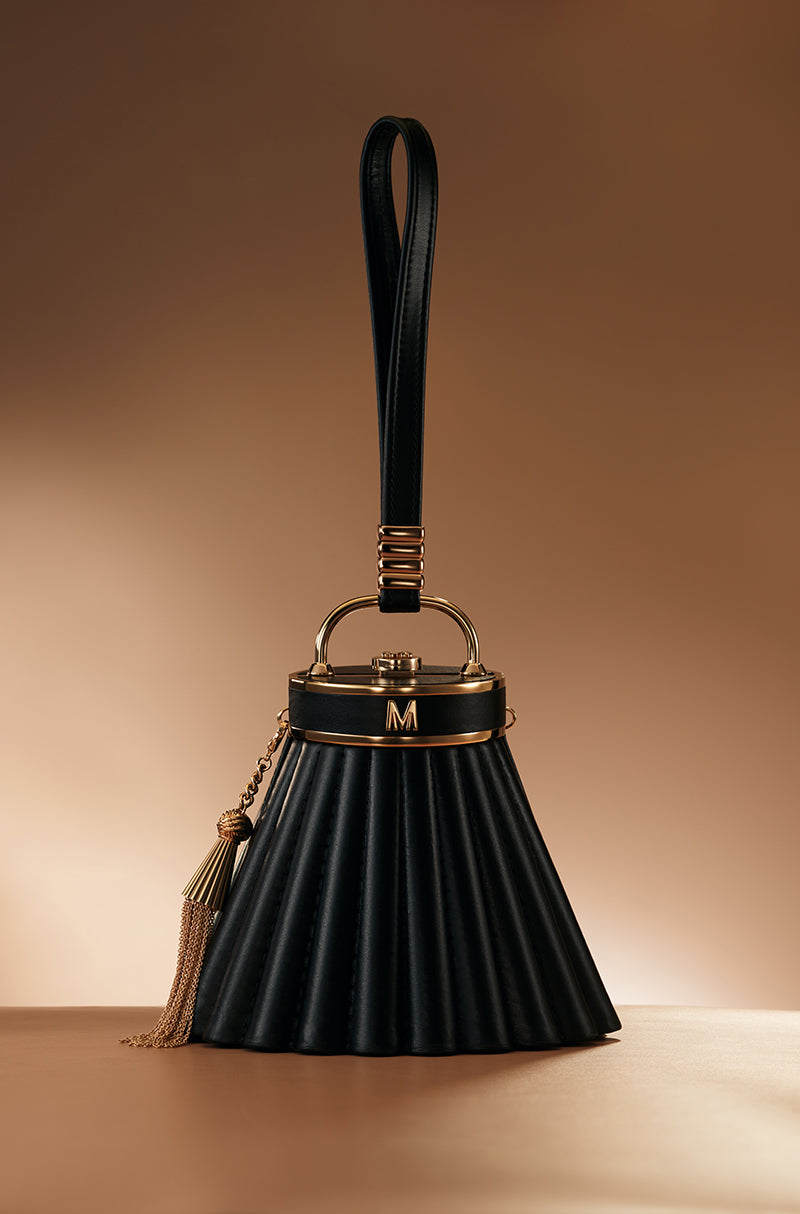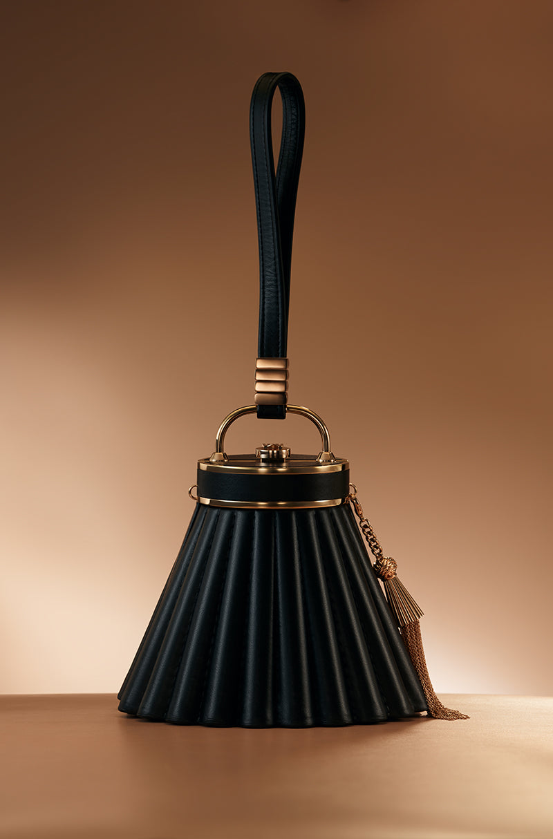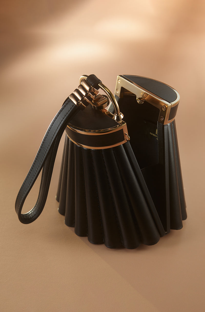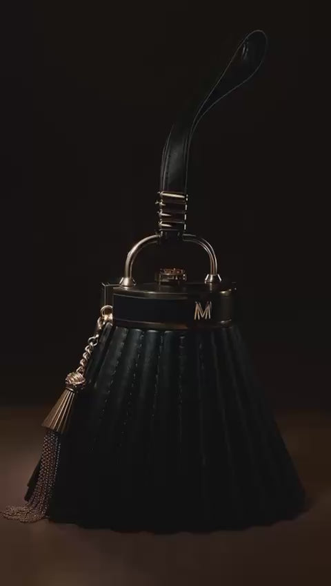 A statement meant for centre stage. A contemporary black leather sling bag designed to command attention. Detailed with rose gold studs, metallic tassels, and a signature Manish Malhotra push-lock, it reflects uncompromising craftsmanship and a bold urban spirit.