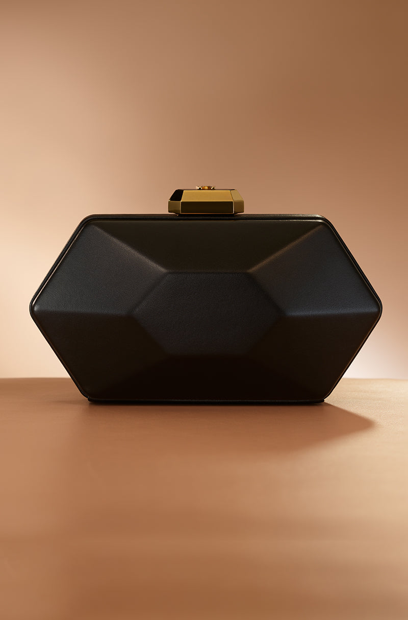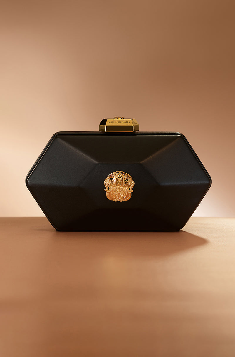 For icons who love icons. Designed for those who never arrive quietly. A bold hexagonal clutch crafted in smooth black leather and defined by a striking metal emblem. Finished with gold plated hardware, a signature Manish Malhotra lift-lock, and a sleek sling chain, it channels confident evening elegance.