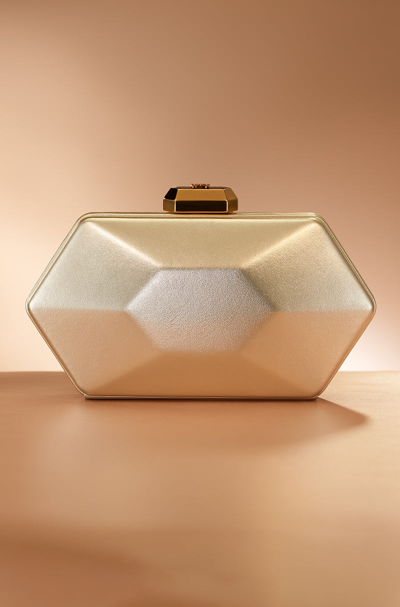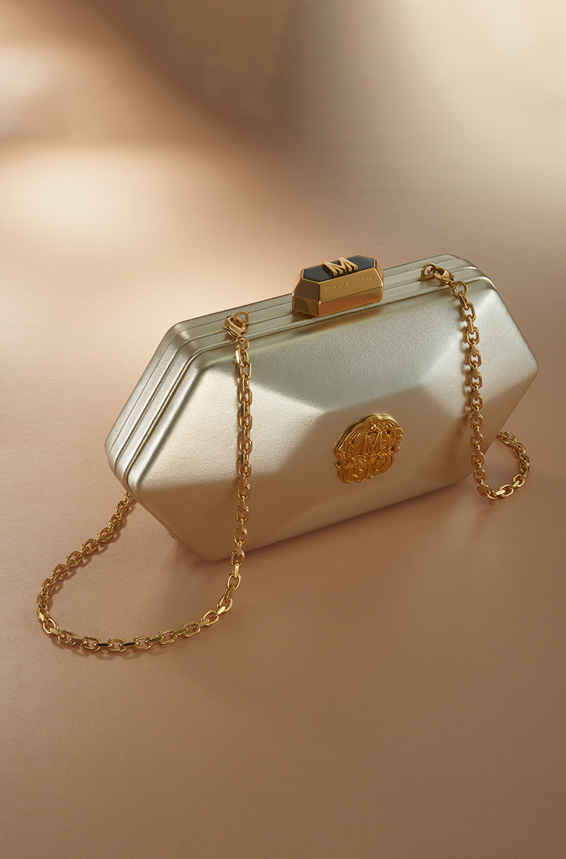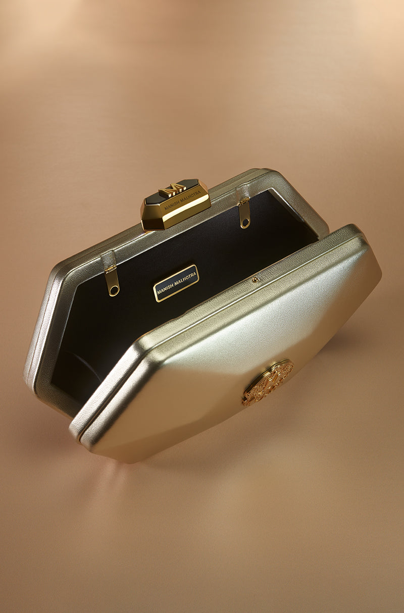 For icons who love icons. Designed for those who never arrive quietly. A statement clutch crafted in metallic foil leather with a sharp hexagonal silhouette. Finished with the signature Manish Malhotra lift-lock, it adds a refined note of modern glamour to evening ensembles.