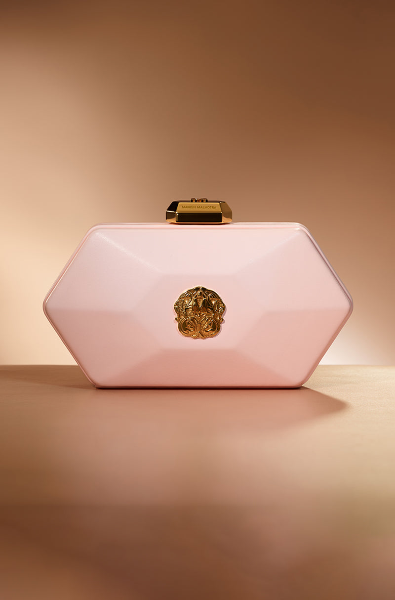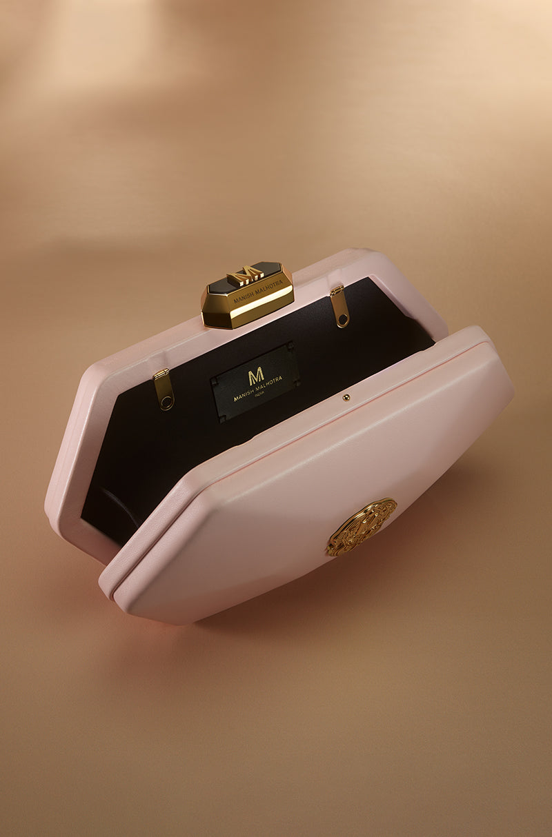 For icons who love icons. Designed for those who never arrive quietly. Defined by its sculpted hexagonal form and pink leather finish, this clutch features a polished metal emblem and a signature Manish Malhotra lift-lock, moving seamlessly from occasion to evening wear.
