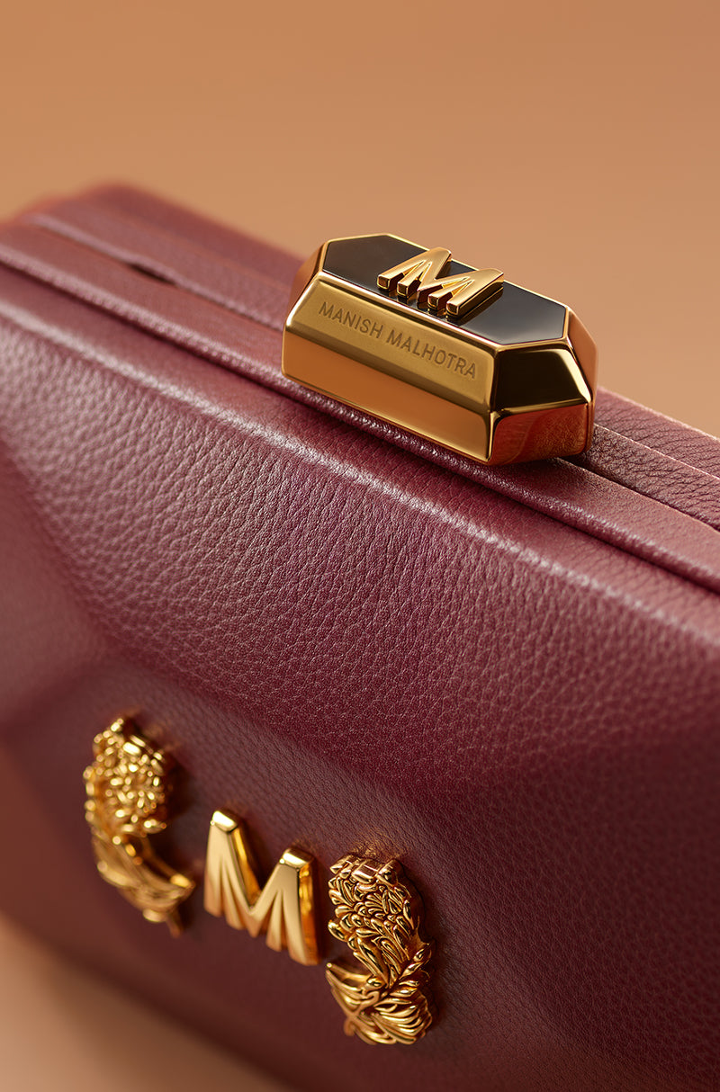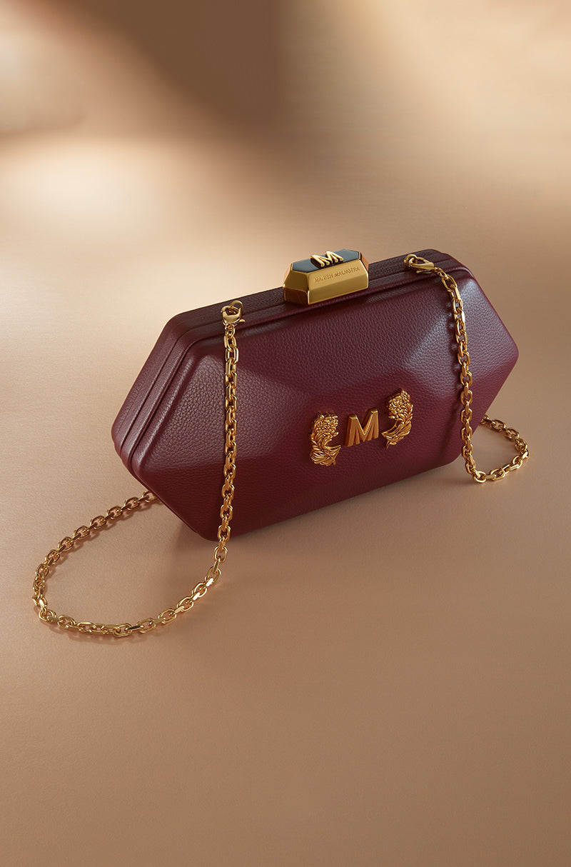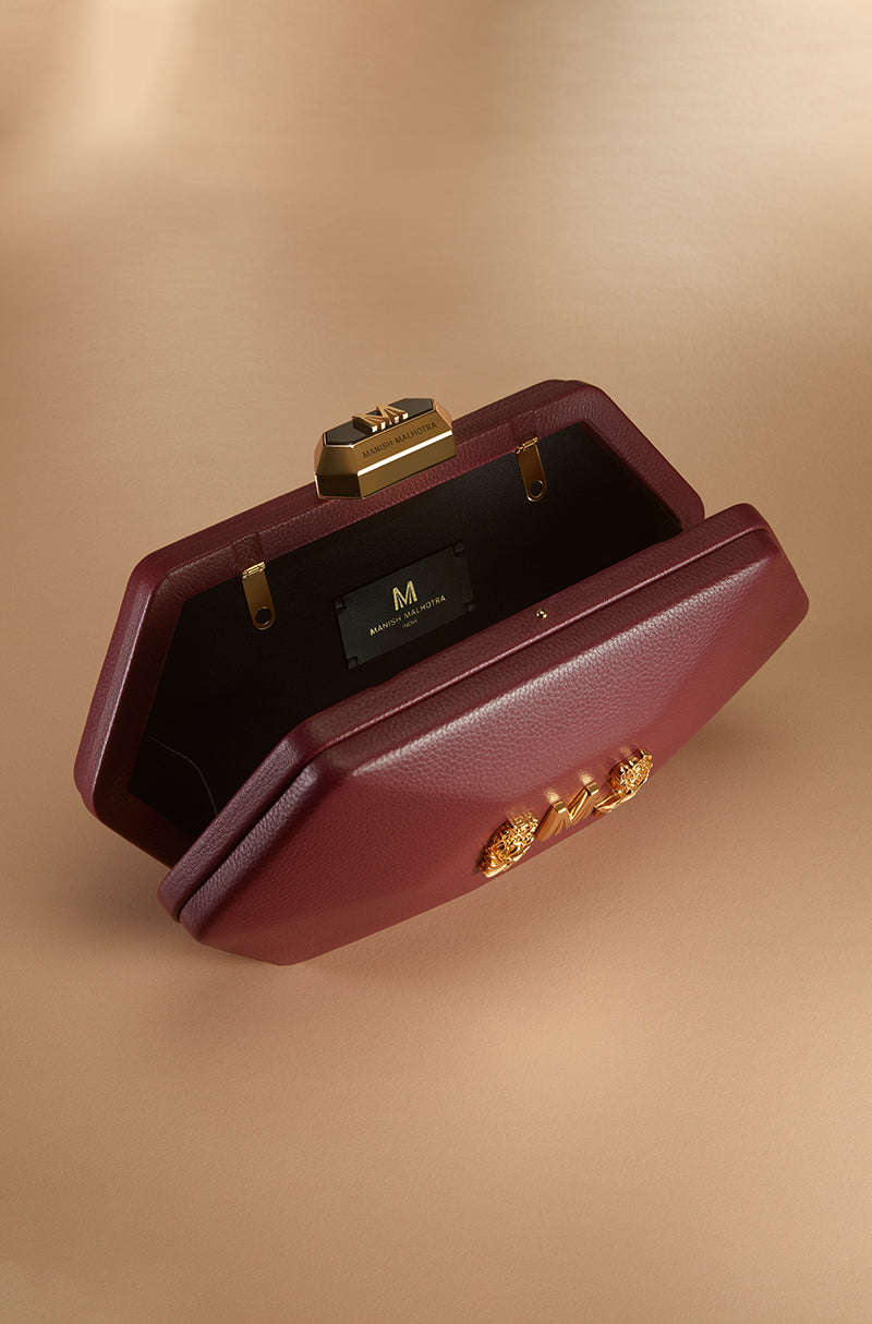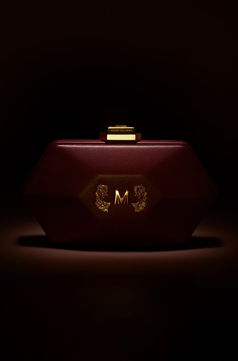 For icons who love icons. Designed for those who never arrive quietly. A bold expression of modern elegance, this red leather clutch is shaped in a refined hexagonal silhouette. Accented with warm gold hardware and a signature Manish Malhotra lift-lock, it brings confidence and drama to after-dark dressing.