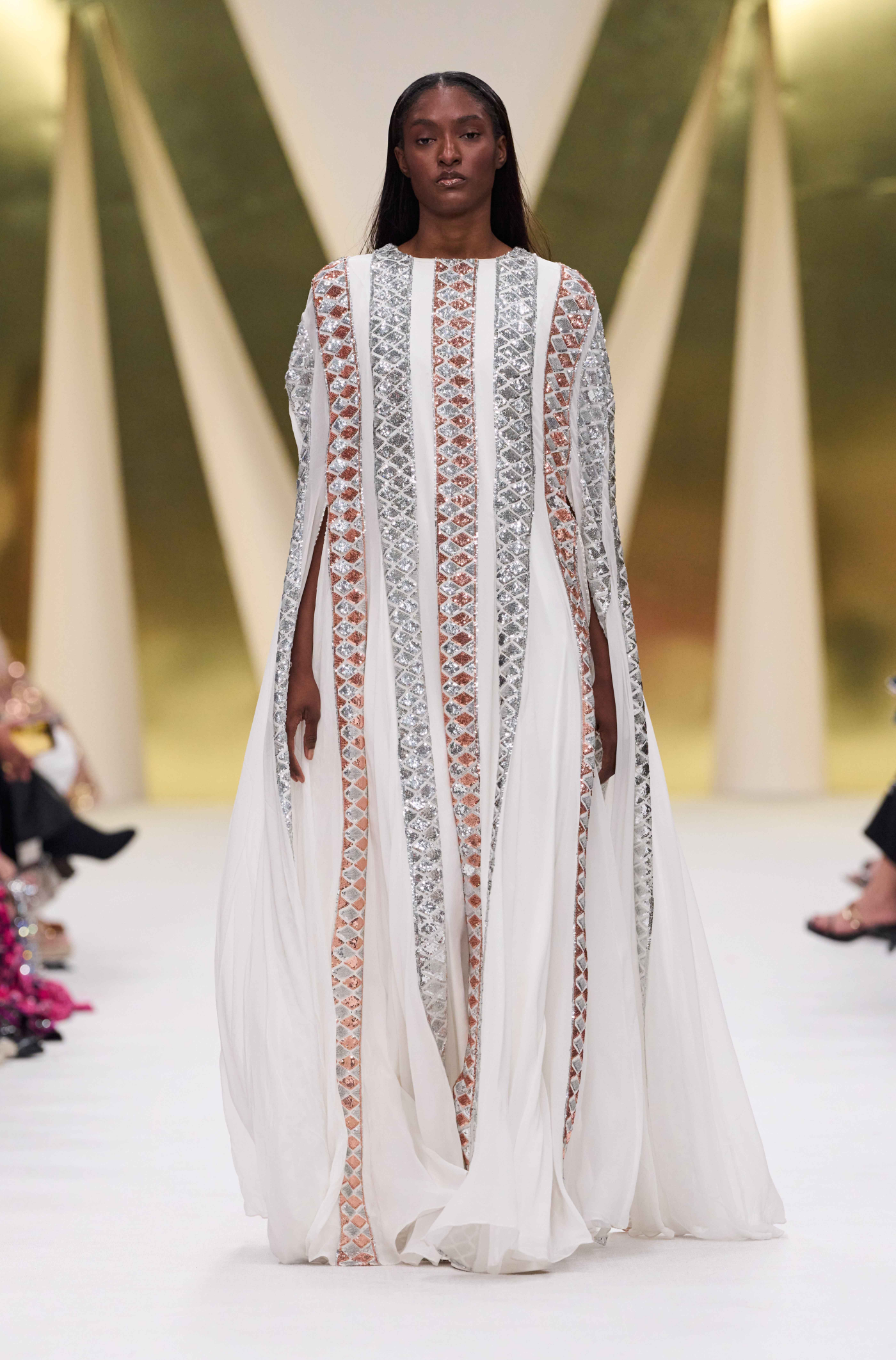 White georgette multicolor sequin border kaftan paired with a white satin slip.